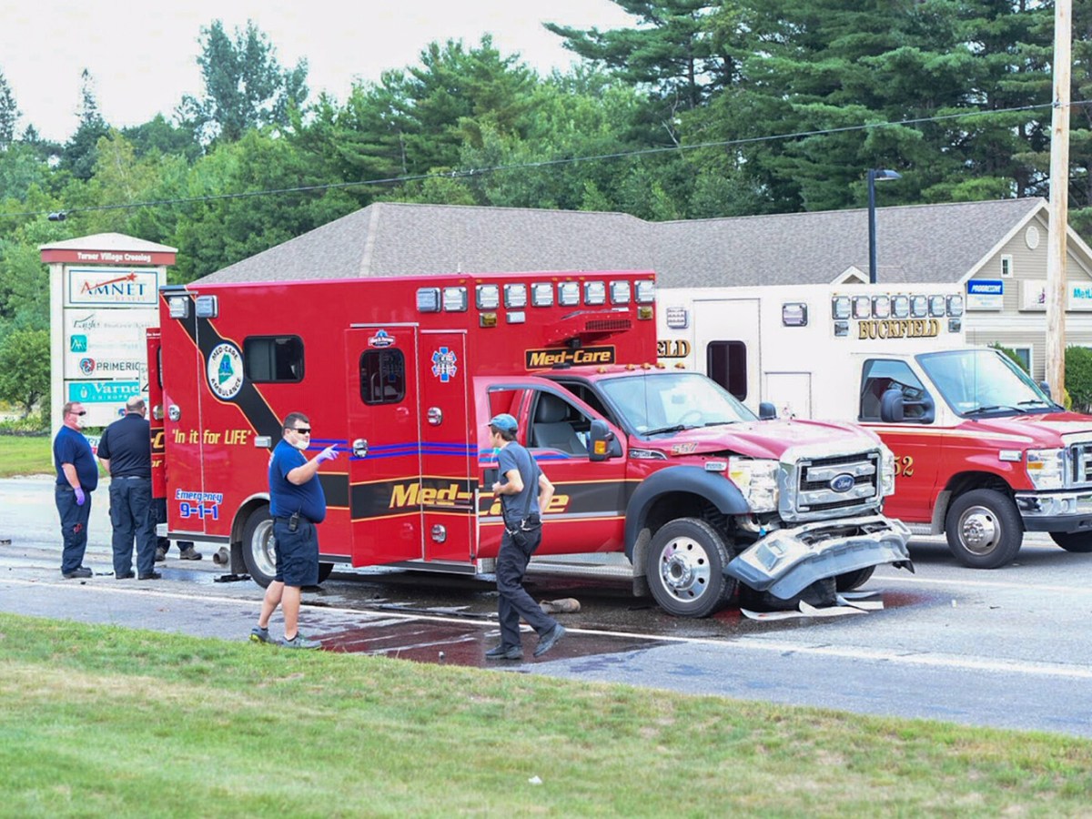 The Med-Care ambulance was taking a patient to a Lewison hospital when the collision occurred at the traffic light in front of Hannaford Supermarket.