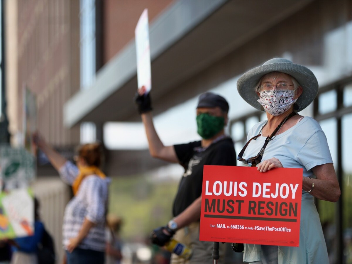 The protesters demand the resignation of Postmaster General Louis DeJoy and say the postal crisis was manufactured by President Trump to boost his re-election.