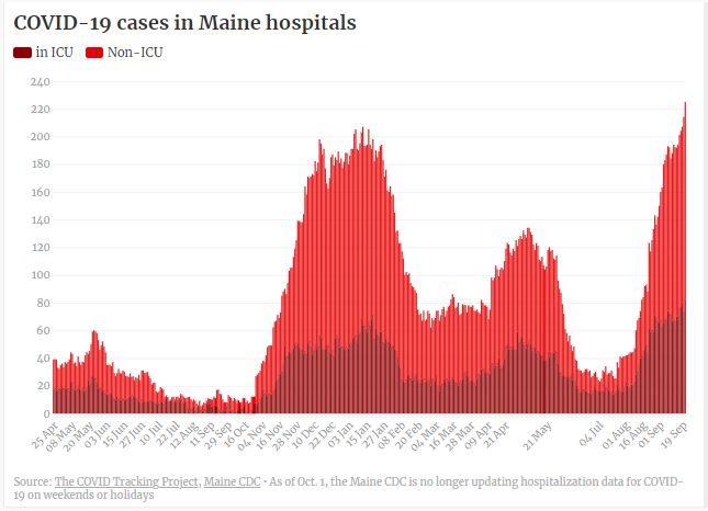 The Maine Center for Disease Control and Prevention reports 338 people hospitalized for COVID-19 throughout the state.