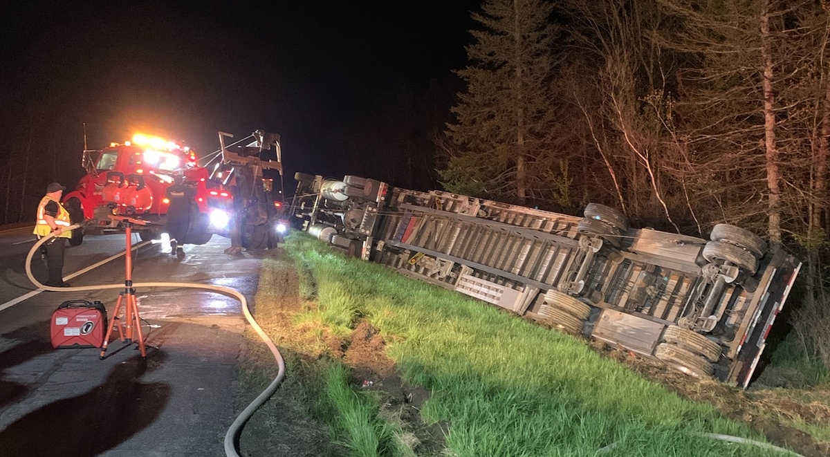 A sedan carrying 2 people crossed into the oncoming lane and collided with a loaded logging truck on Route 9 in Township 30, police say.