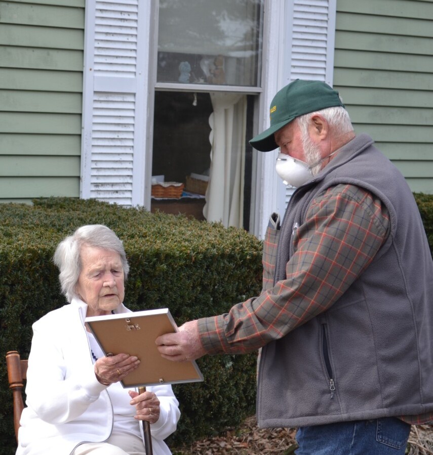 WASHINGTON — Elizabeth “Betty” Grinnell received the Boston Post Cane and certificate March 24, signifying she is the oldest resident in town at the age of 96. Nephew and nieces along with some of their family members and her son were there to cheer her on. Selectman Wesley Daniel presented Grinnell with the cane.