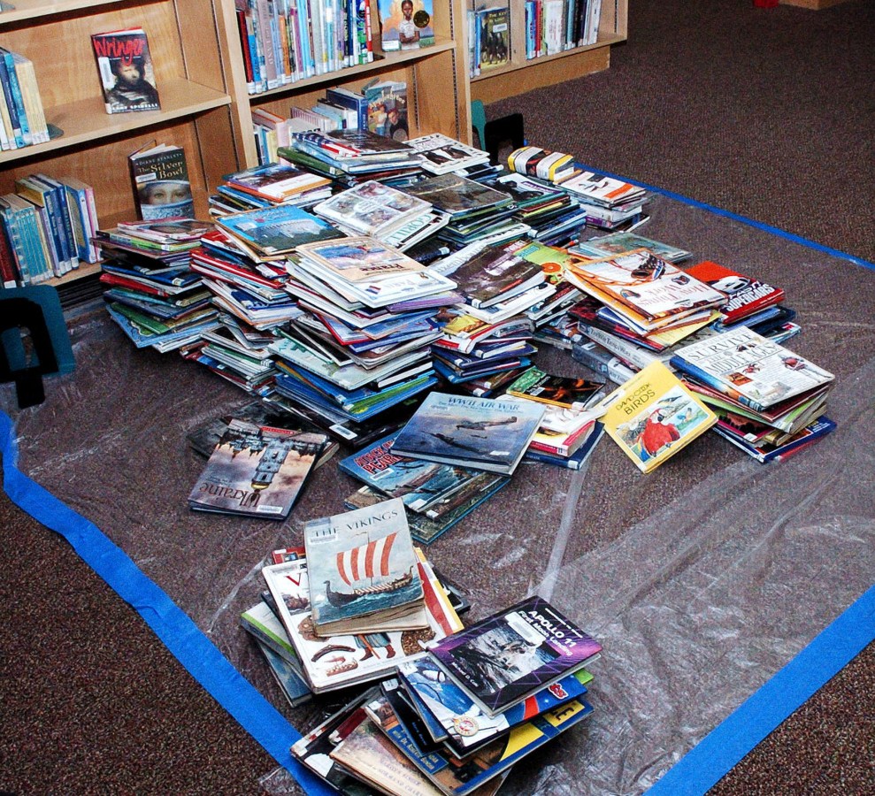 About 500 children’s books and three staff computers were destroyed after a copper pipe burst over the weekend, sending a jet of water into stacks of children’s books on the ground floor.