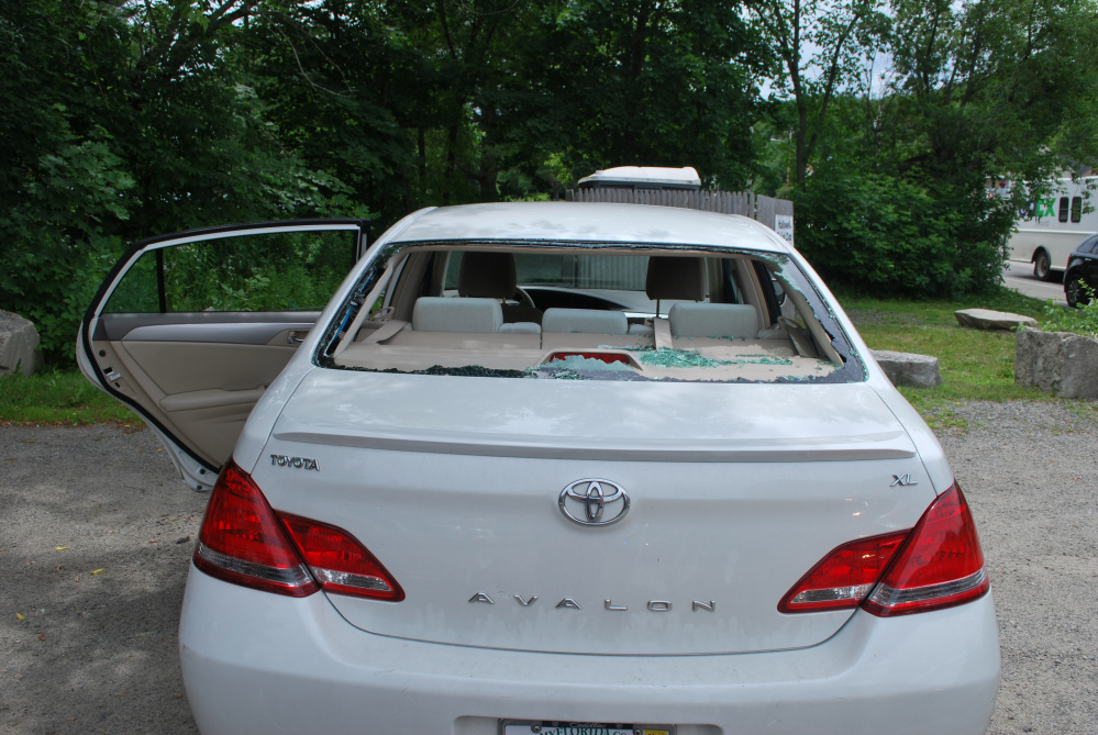 The man, who was wearing a helmet, went flying into the car’s back window, smashing it out, police said.