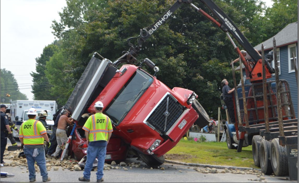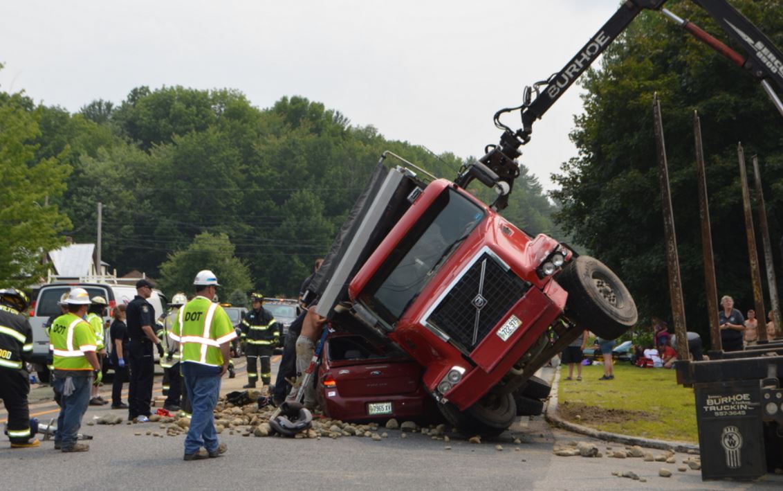 Six people injured when dump truck hauling rocks falls onto car in Wilton