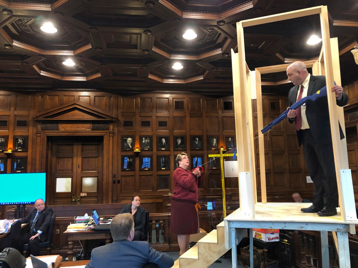The prosecution and defense use a wooden staircase erected in the courtroom to argue their versions of the shooting in which Noah Gaston is charged with murder in his wife’s death.