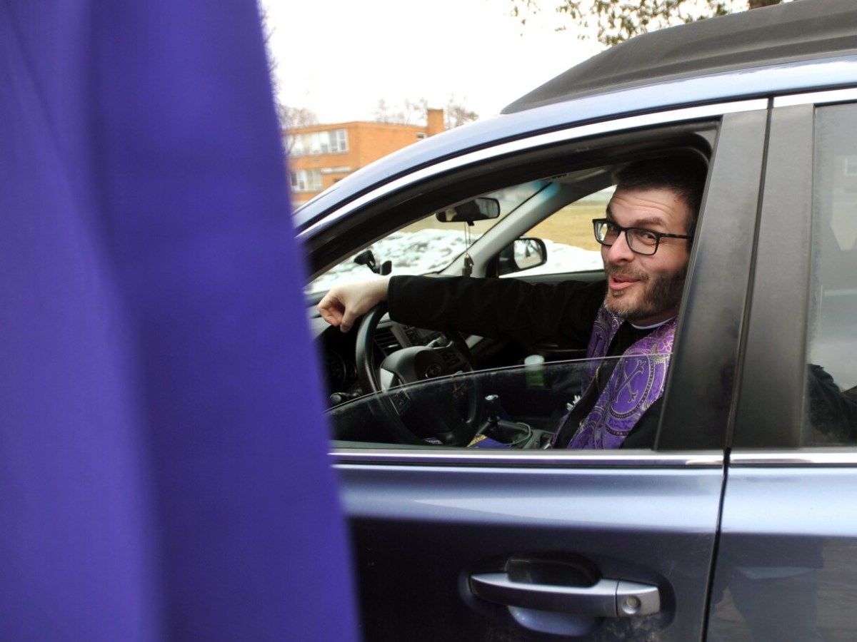 The Rev. Patrick Finn called the cloth confessional in the parking lot of St. John the Baptist Church in Winslow strange, but said that “God is still at work even in the midst of this crazy situation in the world.”