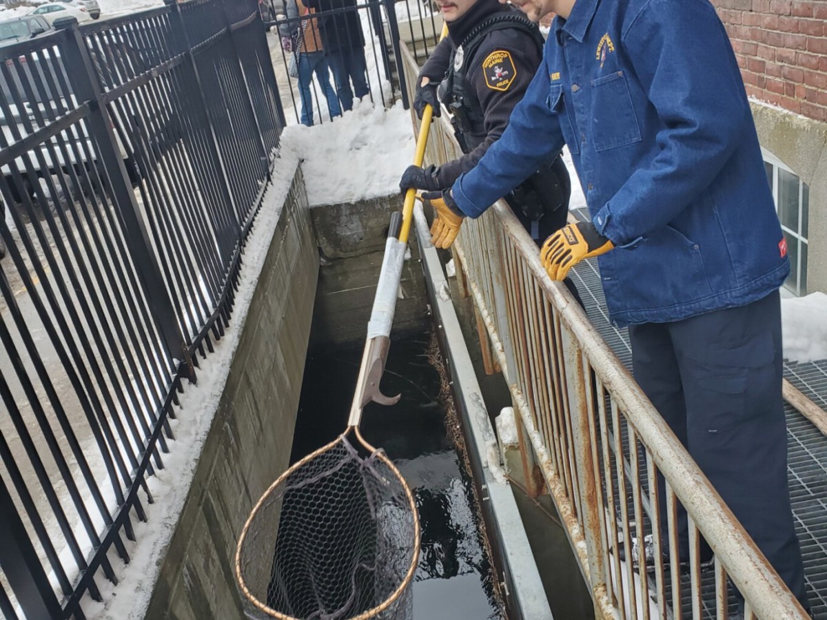 Connor Perkins, a Winthrop firefighter, and his brother Cody Perkins, a Winthrop police officer, rescued three ducks trapped against a grate in the mill stream that flows under Main Street, and they also found several dead ducks.