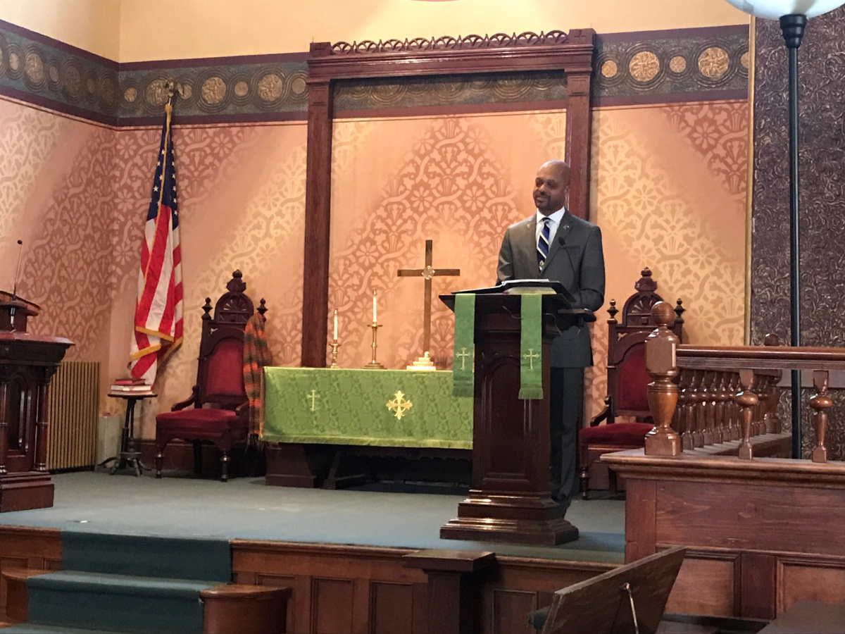 The Winthrop lawmaker spoke about his personal experience and family roots at the Old South First Congregational Church Monday.