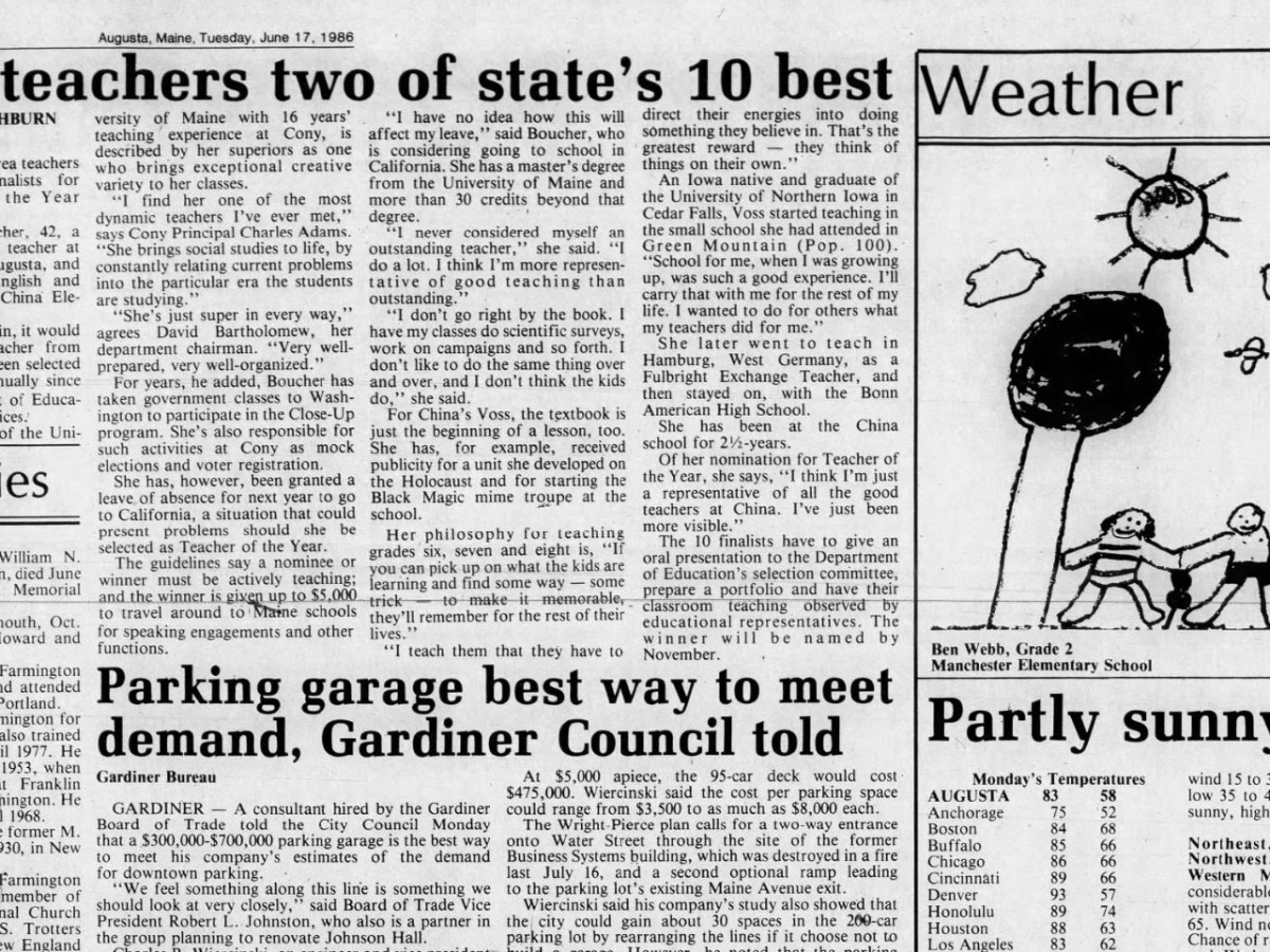 June 17, 1986: Consultant says parking garage is best way to meet demand of downtown parking Gardiner, proposed Winthrop Island Park condominium deliberations begin, and these two local teachers are semifinalists in Maine’s Teacher of the Year award