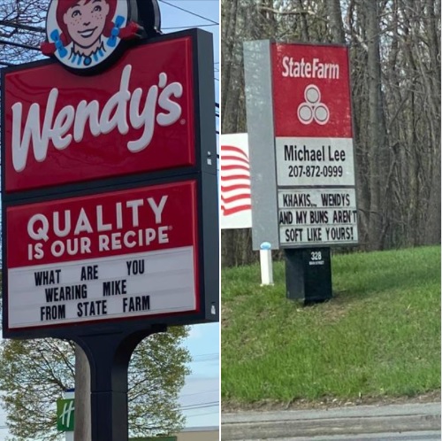 Michael Lee-State Farm Insurance Agent and Wendy’s restaurant on upper Main Street in Waterville are keeping things light with dueling messages on their signs along the heavily-trafficked road.